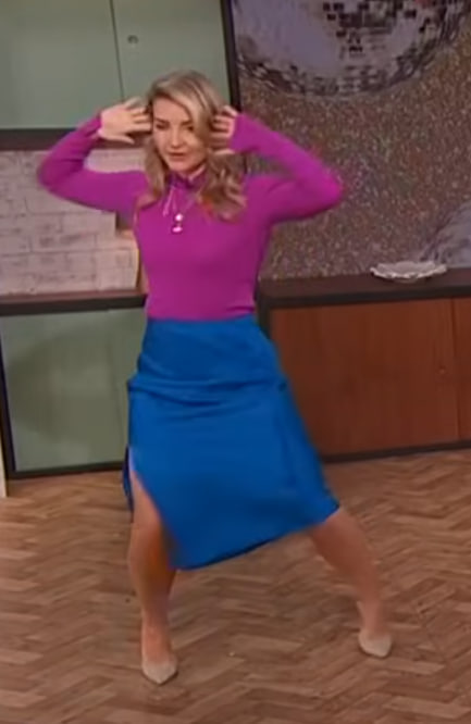 As the cameras rolled, Helen embraced the fun and energy of the show, even joining in on a lighthearted fitness-style challenge. The daring split in her skirt revealed a glimpse of her legs as she lifted her knee during the segment — a perfectly natural moment that nonetheless sparked huge reactions online. Social media quickly lit up with fans praising her confidence, style, and fearless attitude.
