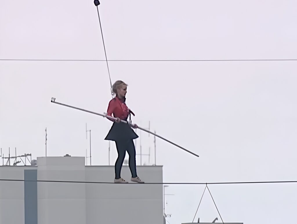 From the start, your heart will beat faster. The camera follows her every step, showing just how tense and dramatic the moment really is. With a long balancing pole in her hands, she steps onto the cable — her feet barely wider than the steel line it sits upon. You can almost feel the tension in her muscles and the concentration in her eyes as each step forward is a massive test of courage.