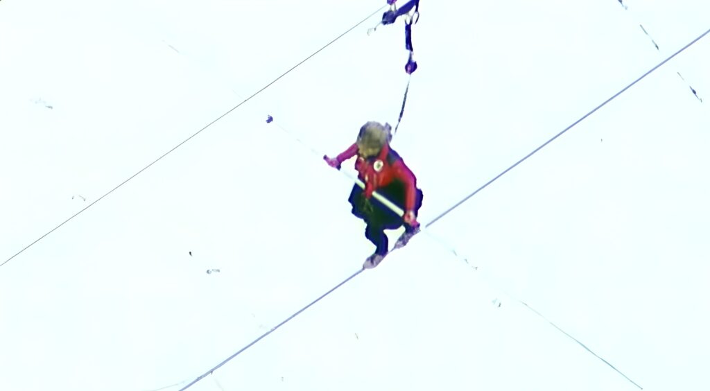 As she moves further along the wire, the height becomes more apparent. The camera pulls back so you can really feel how high she’s climbing. From this angle, it’s not just a challenge — it’s a breathtaking display of bravery.
