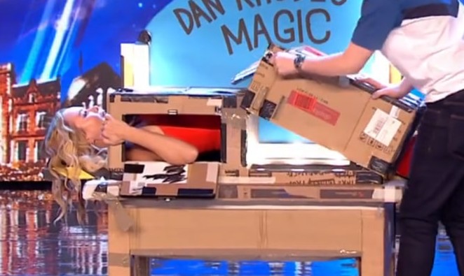 The laughter turns into nervous giggles as Dan invites Amanda Holden to take part in the trick. And unbelievably — she agrees! When Amanda lies down inside a cardboard contraption labeled “Magic,” you can literally feel the tension building in the room. Is she being brave… or is this about to become the scariest decision she’s ever made? 😳